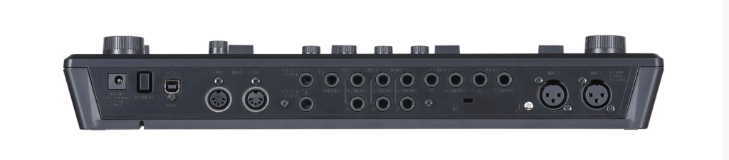 Dispone de dos conexiones de micrófono XLR con alimentación phantom de 48 V, y dos entradas de instrumento estéreo en formato jack de 6,3 mm. Cuenta con tres salidas jack estéreo (Main, Sub1, Sub2), que también pueden ser utilizadas como salidas mono a través del canal izquierdo. Ahí va un pequeño truco o TIP: en realidad las seis tomas jack de estas tres salidas estéreo se pueden configurar (a través del software del dispositivo) como salidas mono para las pistas individuales.